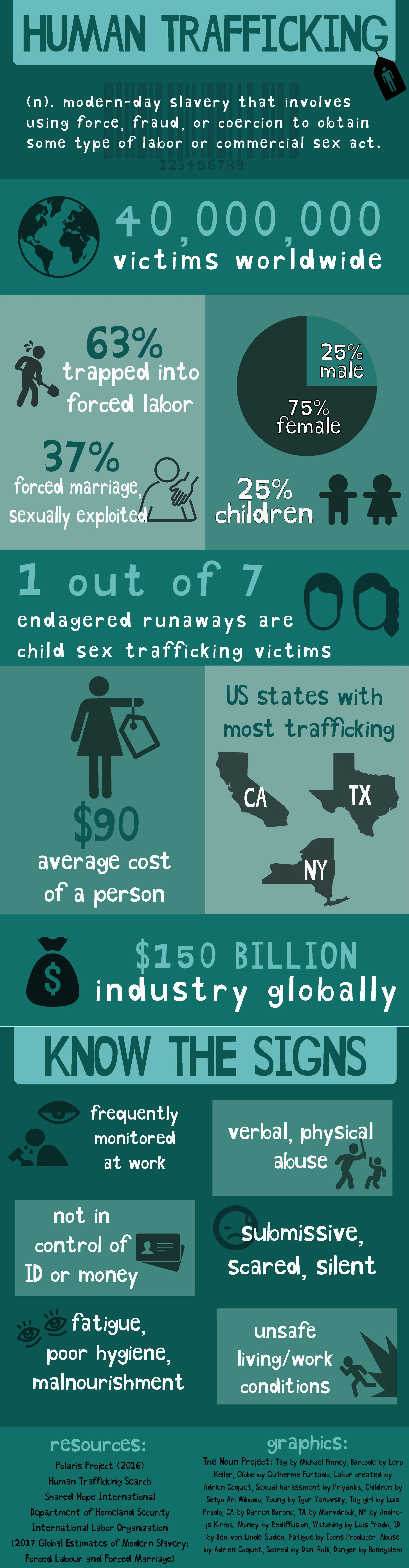 Below is an infographic that I made using Adobe Illustrator for a project in my Advanced Digital Production class. The assignment was to educate a general audience about a social justice issue using an infographic format. I decided to make mine about human trafficking. I provided a definition of the issue, statistics, and how to spot the signs of human trafficking.